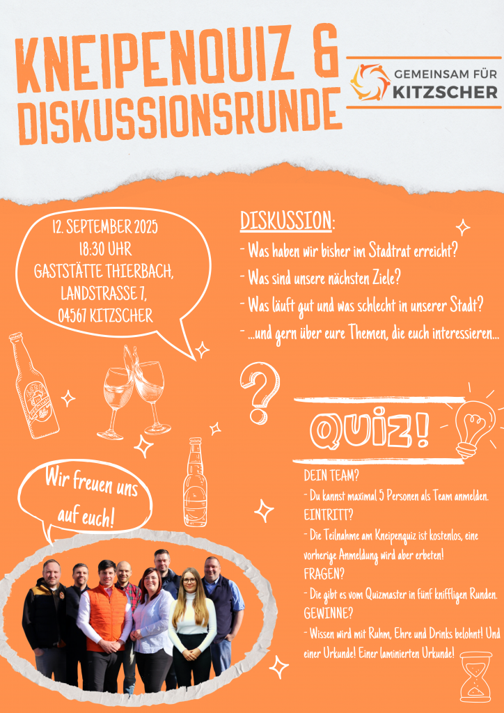 Über obige Themen und vieles mehr laden wir euch zum gemeinsamen Plausch ein! Die gemütliche Runde – mit einem spaßigen Kneipenquiz – findet am 12.09.2025 um 18:30 Uhr in der Gaststätte Thierbach statt!